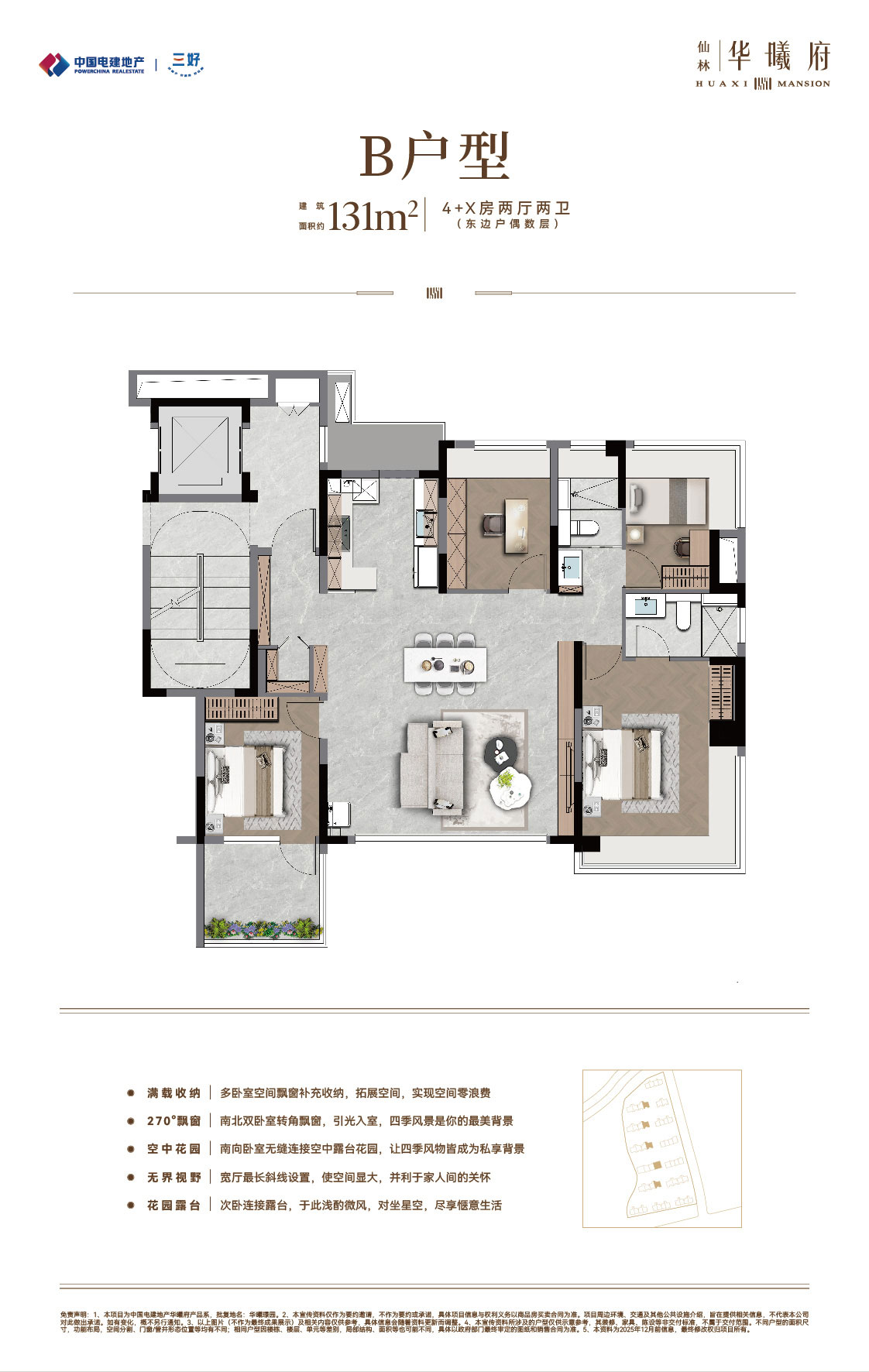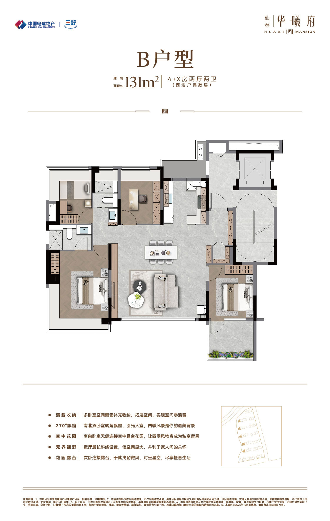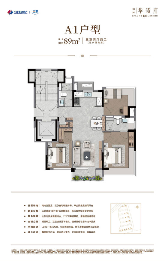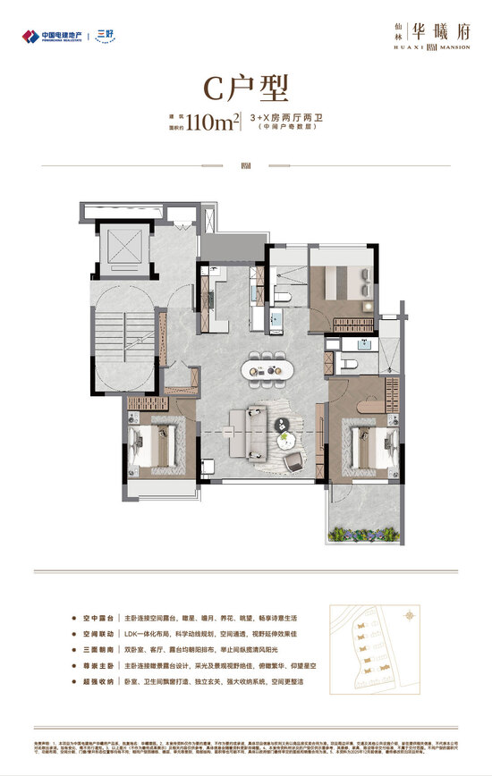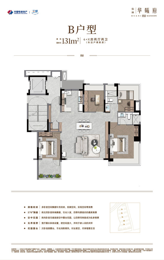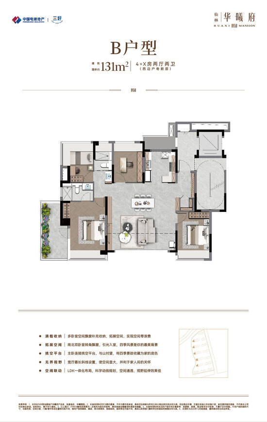 中国电建地产·仙林华曦府项目位于南京仙林湖板块,邻近地铁4号线/2号线/S5号线摄山站(在建中),靠近金陵小学、金陵中学等教育资源,并可享万达茂、金鹰湖滨天地等商业设施。作为电建“绿水青山”系-绿系-华曦府作品,项目主力打造第四代纯洋房住宅,容积率为1.5,规划了14栋9-10层、户型建筑面积约89-131㎡的低密洋房,致力于营造现代低密生活体验。产品与配套方面,项目秉承“建房之前先建城”理念,优先打造了两大主题公园:南京首个桥洞运动主题公园-“仙林湖元气场” 和区域首个滨水露营主题公园-“华曦公园”,为居民提供了丰富的休闲选择。此外,社区内还规划有双会所,涵盖健身、社交等功能;约65㎡酒店式门庭,高山流水轻奢立面,多维度实现项目高品质。(项目信息以政府公示及合同约定为准。)